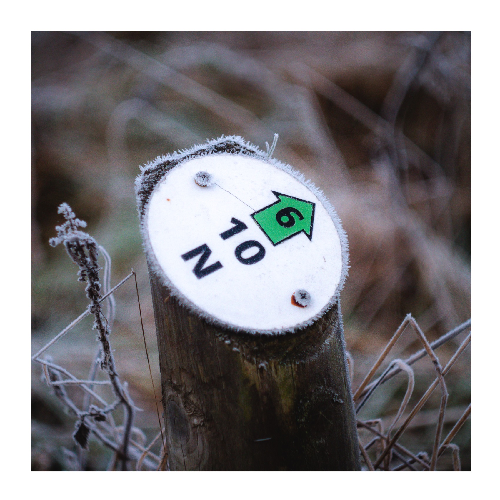 Main image: The geocaching marker ‘6 10 N’ on a frosty morning.